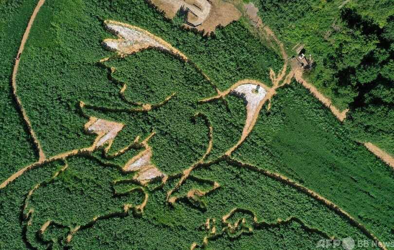 面積約1万8000平方メートル、全長約3.1キロの迷路は、地元農家とその従業員20人で制作。ヒマワリ、大麻(ヘンプ)、豆やトウモロコシなど35万本の植物が使われている。20日から一般にオープン。(c)AFP