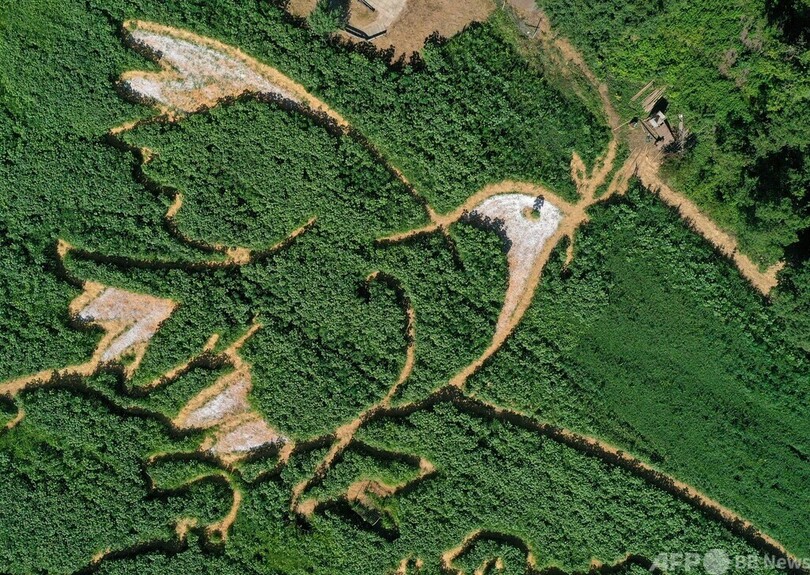 面積約1万8000平方メートル、全長約3.1キロの迷路は、地元農家とその従業員20人で制作。ヒマワリ、大麻(ヘンプ)、豆やトウモロコシなど35万本の植物が使われている。20日から一般にオープン。(c)AFP