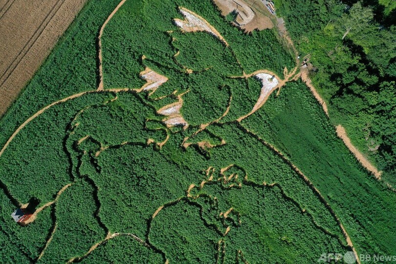 面積約1万8000平方メートル、全長約3.1キロの迷路は、地元農家とその従業員20人で制作。ヒマワリ、大麻(ヘンプ)、豆やトウモロコシなど35万本の植物が使われている。20日から一般にオープン。(c)AFP