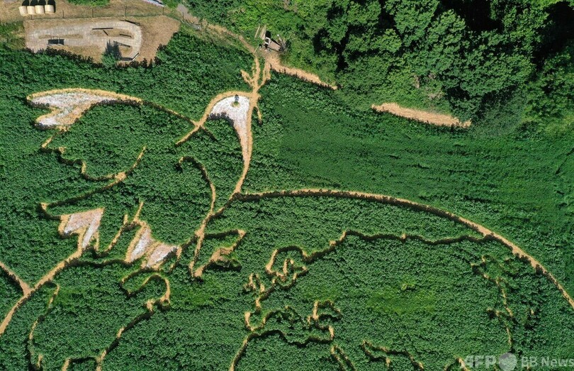 面積約1万8000平方メートル、全長約3.1キロの迷路は、地元農家とその従業員20人で制作。ヒマワリ、大麻(ヘンプ)、豆やトウモロコシなど35万本の植物が使われている。20日から一般にオープン。(c)AFP