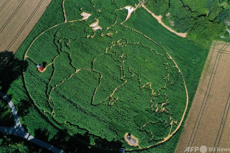 面積約1万8000平方メートル、全長約3.1キロの迷路は、地元農家とその従業員20人で制作。ヒマワリ、大麻(ヘンプ)、豆やトウモロコシなど35万本の植物が使われている。20日から一般にオープン。(c)AFP