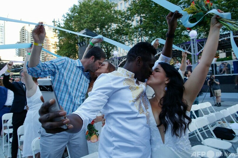 【7月16日 AFP】米ニューヨークで今月、カップル約500組の集団結婚式が行われた。新型コロナウイルス禍で生じた「傷」を癒やすための試みで、参加した新郎新婦たちはお互いを祝福し合った。
