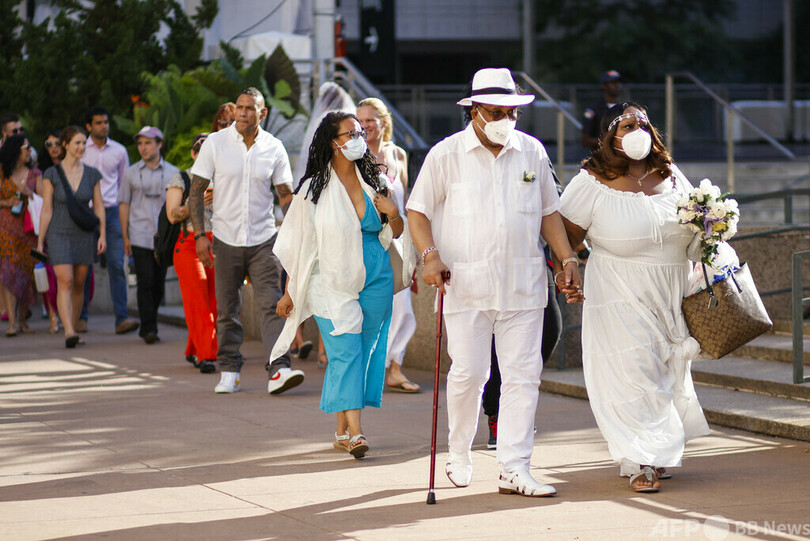 【7月16日 AFP】米ニューヨークで今月、カップル約500組の集団結婚式が行われた。新型コロナウイルス禍で生じた「傷」を癒やすための試みで、参加した新郎新婦たちはお互いを祝福し合った。