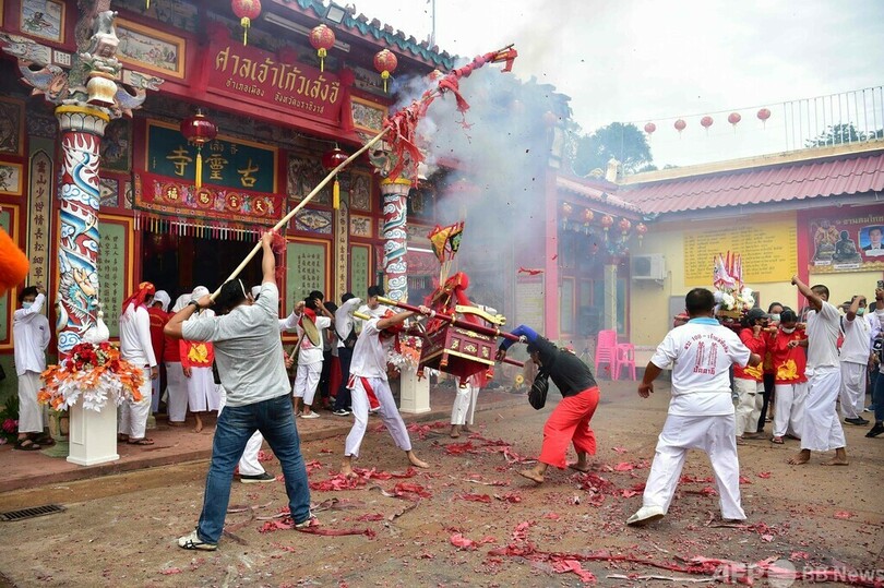 頬に串刺し通りを行進 タイ南部で毎年恒例の祭り