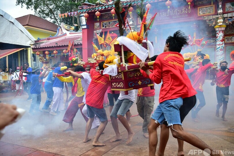 頬に串刺し通りを行進 タイ南部で毎年恒例の祭り