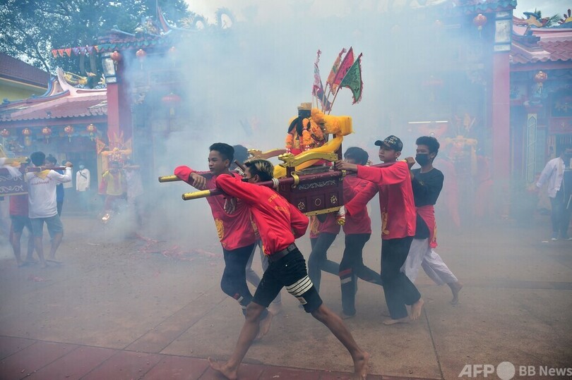 頬に串刺し通りを行進 タイ南部で毎年恒例の祭り