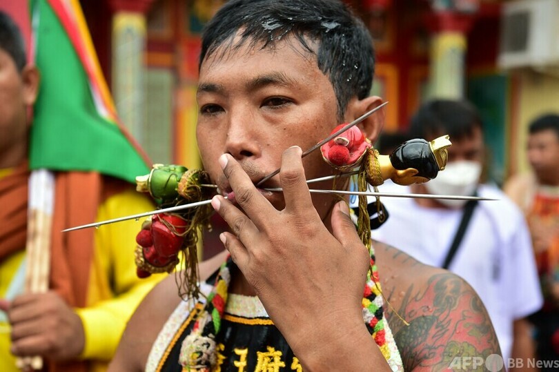 頬に串刺し通りを行進 タイ南部で毎年恒例の祭り