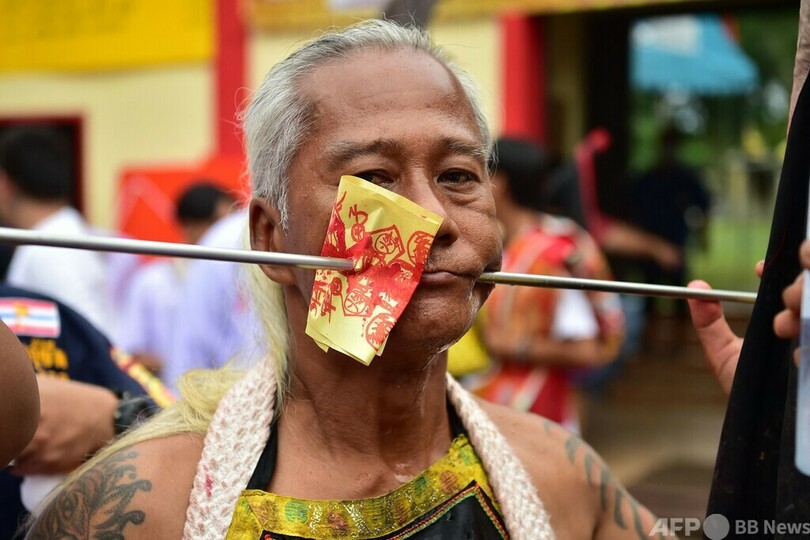 頬に串刺し通りを行進 タイ南部で毎年恒例の祭り