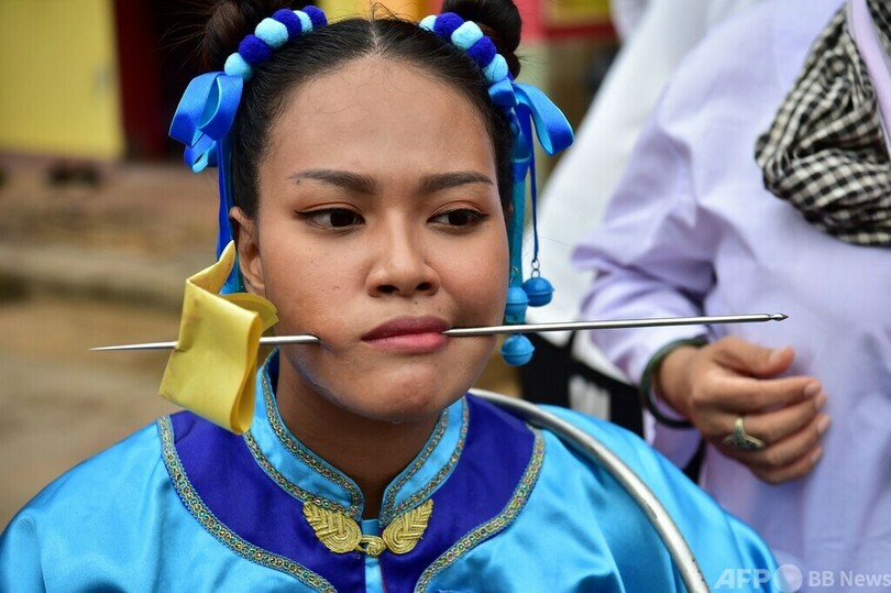 頬に串刺し通りを行進 タイ南部で毎年恒例の祭り