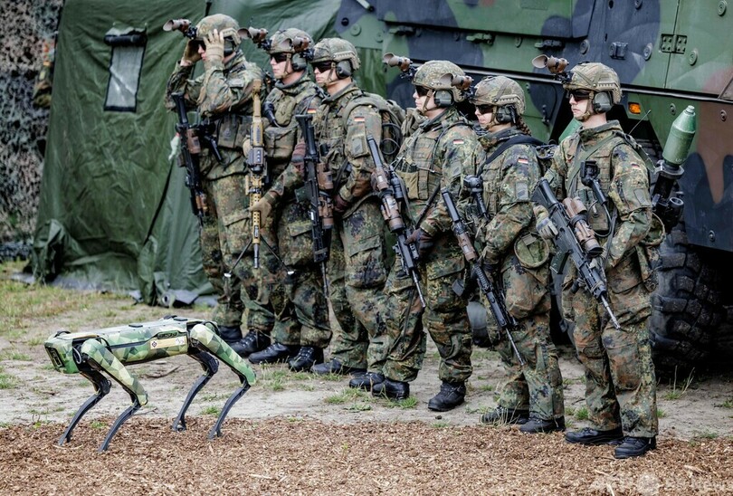 【7月24日 AFP】ドイツ北西部ミュンスター(Munster)で、ドイツ連邦軍(Bundeswehr)の兵士の前を歩く多機能ロボット犬の「ボルフガング(Wolfgang)」。陸上作戦デジタル化部隊を訪問した同国の国防相に対して、機材の説明が行われた。(c)AFP