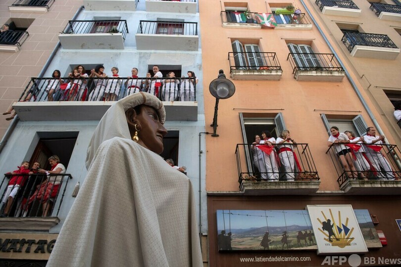 【7月16日 AFP】スペイン北部ナバーラ(Navarra)州パンプロナ(Pamplona)の「サン・フェルミン祭(San Fermin Festival)」で今週、巨大人形のパレードが行われた。大頭の仮面をかぶった人々が大人や子どもを追い掛け回す姿も見られた。今年のサン・フェルミン祭は、14日に終了した。(c)AFP