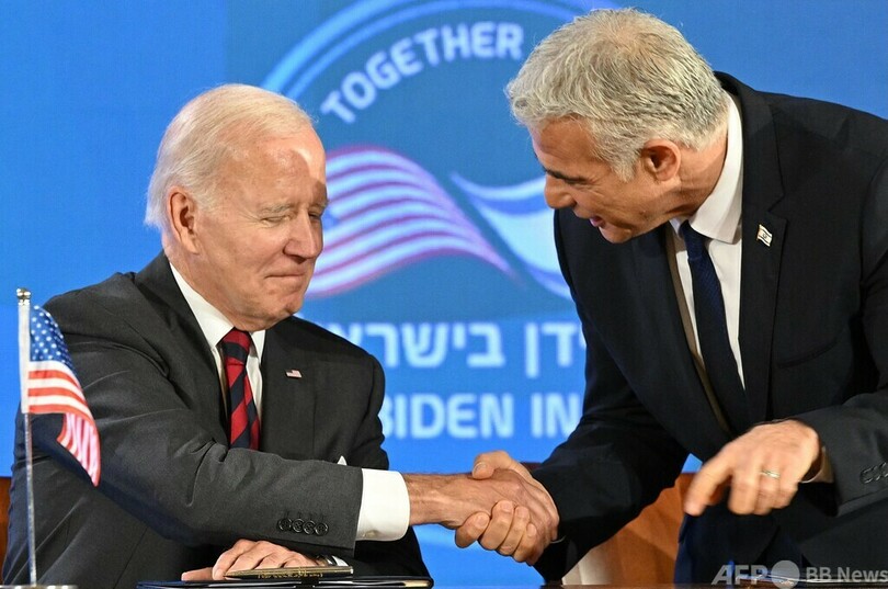 【7月15日 AFP】中東歴訪の一環としてイスラエルを訪れたジョー・バイデン(Joe Biden)米大統領は14日、ヤイル・ラピド(Yair Lapid)暫定首相と会談し、両国が共通の脅威と位置付けるイランの核兵器保有阻止のため安全保障分野での協力関係を強化する「エルサレム宣言(Jerusalem Declaration)」に署名した。