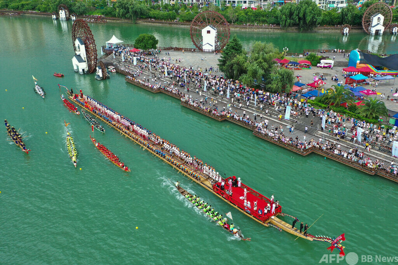 民族衣装をまとった人々が一斉にオールを操り、多くのボートが水辺を行進。圧巻だったのは長さ77.8メートルの木造ドラゴンボート。他のボートの数倍の大きさで、沿岸の観客はその迫力に目を奪われていた。(c)CNS/JCM/AFPBB News