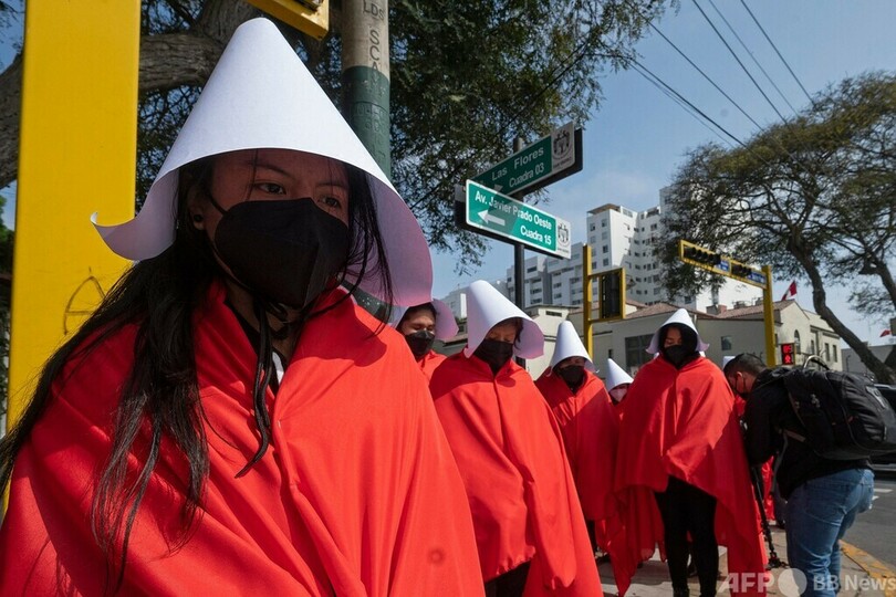 【7月20日 AFP】ペルーの首都リマで18日、テレビドラマ「ハンズメイド・テイル/侍女の物語(The Handsmaid's Tale)」のキャラクターに扮(ふん)した女性やトランスジェンダーの人々約30人が、国連(UN)人権高等弁務官に対し、女性が日常的に暴力に直面している国内の状況を訴えた。
