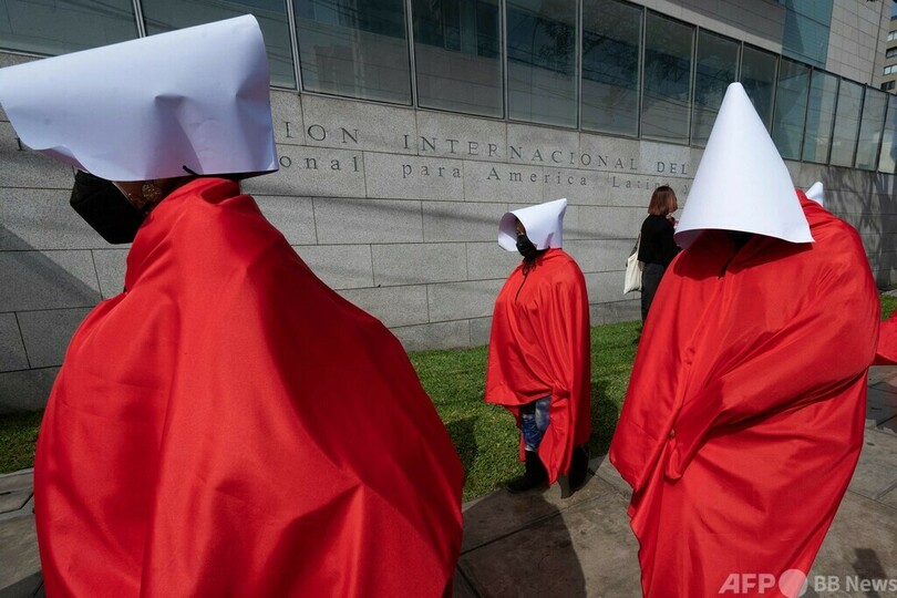 【7月20日 AFP】ペルーの首都リマで18日、テレビドラマ「ハンズメイド・テイル/侍女の物語(The Handsmaid's Tale)」のキャラクターに扮(ふん)した女性やトランスジェンダーの人々約30人が、国連(UN)人権高等弁務官に対し、女性が日常的に暴力に直面している国内の状況を訴えた。
