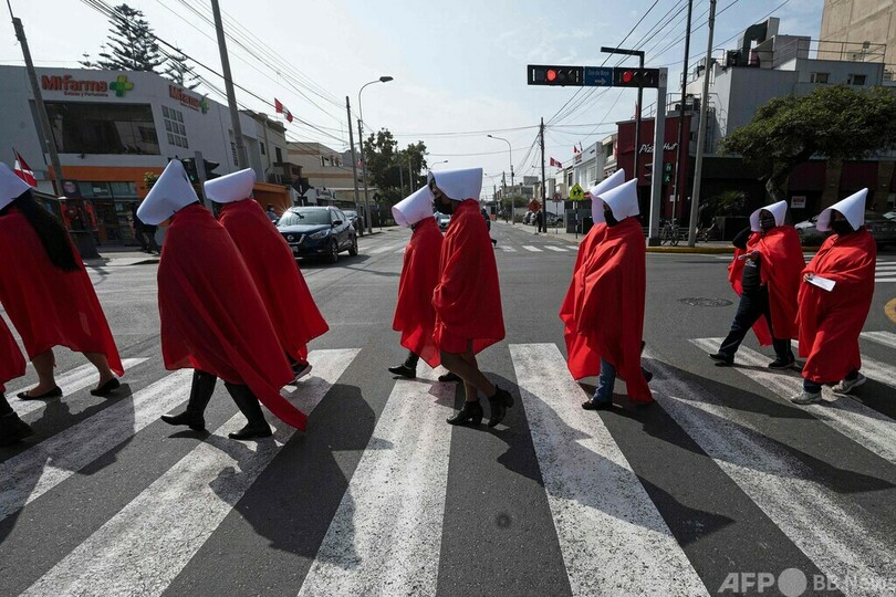 【7月20日 AFP】ペルーの首都リマで18日、テレビドラマ「ハンズメイド・テイル/侍女の物語(The Handsmaid's Tale)」のキャラクターに扮(ふん)した女性やトランスジェンダーの人々約30人が、国連(UN)人権高等弁務官に対し、女性が日常的に暴力に直面している国内の状況を訴えた。