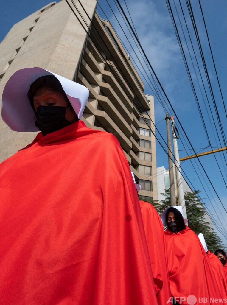 【7月20日 AFP】ペルーの首都リマで18日、テレビドラマ「ハンズメイド・テイル/侍女の物語(The Handsmaid's Tale)」のキャラクターに扮(ふん)した女性やトランスジェンダーの人々約30人が、国連(UN)人権高等弁務官に対し、女性が日常的に暴力に直面している国内の状況を訴えた。