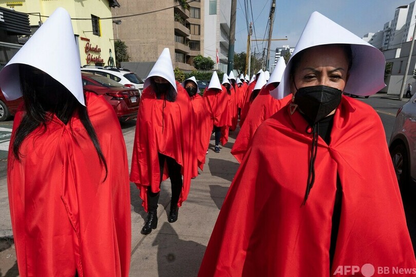 【7月20日 AFP】ペルーの首都リマで18日、テレビドラマ「ハンズメイド・テイル/侍女の物語(The Handsmaid's Tale)」のキャラクターに扮(ふん)した女性やトランスジェンダーの人々約30人が、国連(UN)人権高等弁務官に対し、女性が日常的に暴力に直面している国内の状況を訴えた。