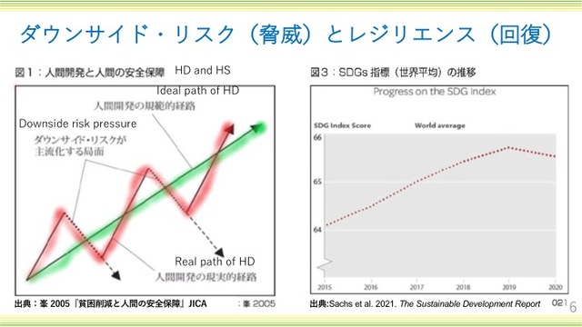 気候変動、紛争あるいは新型コロナウイルス禍などのショック、さまざまな脅威があって、ダウンサイドリスクによって(赤い線は)下方に振れる。「人間の安全保障」はそれに対して、人々と社会のレジリエンス(回復力)を強化することによって押し上げる。レジリエンスを強化することにより、元の軌道に戻していくという力を持ちます。