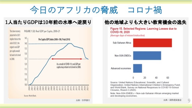 ではアフリカに目を向けていきましょう。まずコロナ禍の影響。アフリカの1人当たりGDP(域内総生産)は2000年代、良くなっていた。しかし、2015年をピークにどんどん悪くなって、コロナ禍によって2020年、2021年に非常に悪くなった。その結果、今ではアフリカの1人当たりGDPは10年前の水準に戻った(左の図参照)。