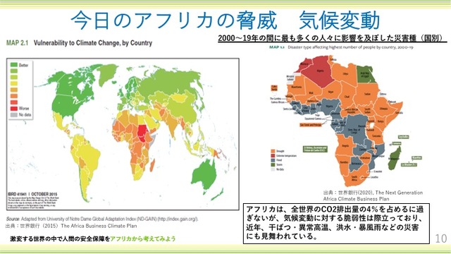 二つ目は気候変動。全世界のCO2(二酸化炭素)の排出量からするとアフリカの排出量はそんなに大きくないけれども、気候変動に対する脆弱性は大きい(図参照)。