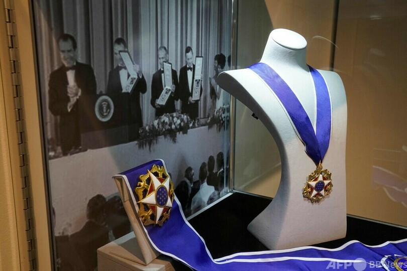 アポロ11号の飛行計画書やオルドリン氏が着用した船内服、当時のリチャード・ニクソン(Richard Nixon)大統領から同氏に贈られた最高勲章の大統領自由勲章(Presidential Medal of Freedom)などが、米ニューヨークのサザビーズ(Sotheby’s)で行われたメディア向けプレビューで公開された。(c)AFP