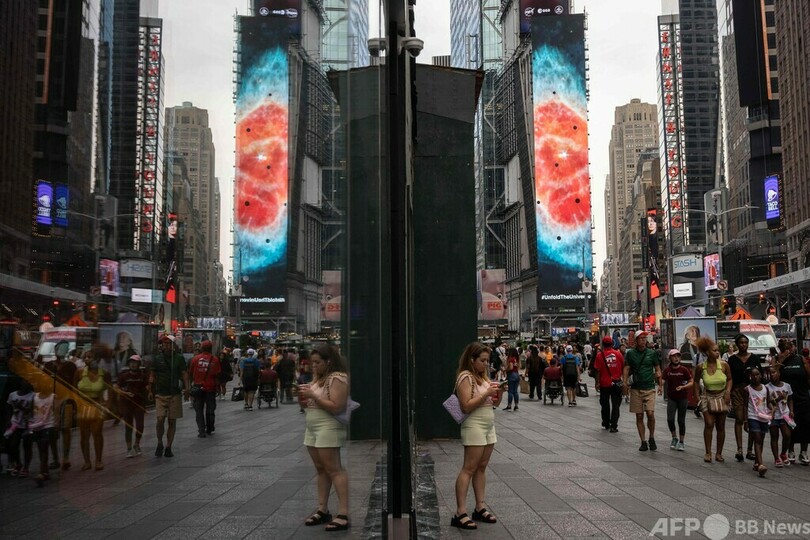 【8月1日 AFP】米ニューヨークのタイムズスクエア(Times Square)の大型ディスプレーに表示される、ジェームズ・ウェッブ宇宙望遠鏡(James Webb Space Telescope)が捉えた画像。ゴダード宇宙飛行センター(Goddard Space Flight Center)で順次公開された赤外線画像は、前例のない明瞭さで深遠な宇宙を写し出し、100億ドル(約1兆3500億円)を費やして製造されたウェッブ宇宙望遠鏡の実力を余すところなく発揮した。(c)AFP
