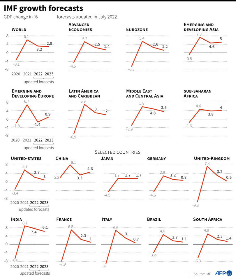【7月27日 AFP】国際通貨基金(IMF)は26日、最新の世界経済見通し(World Economic Outlook)で、インフレ急進と米国と中国での深刻な景気減速を受け、今年と来年の成長率を4月の前回見通しから下方修正した。状況はさらに悪化する恐れがあると警告している。