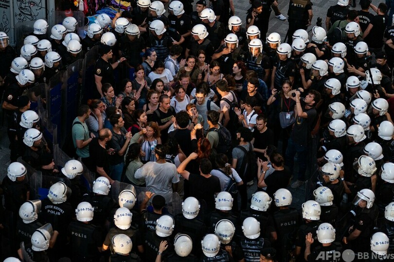 【8月2日 AFP】トルコ・イスタンブールのカドキョイ(Kadikoy)地区でデモに参加した左派の若者たちと、それを取り囲む警察官ら。