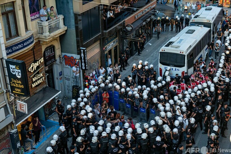 【8月2日 AFP】トルコ・イスタンブールのカドキョイ(Kadikoy)地区でデモに参加した左派の若者たちと、それを取り囲む警察官ら。