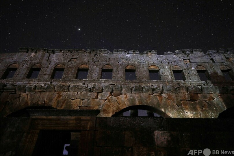 【8月7日 AFP】5世紀に建てられたシリアのバシリカ式教会堂と、上空に昇る天の川銀河(銀河系、Milky Way)。
