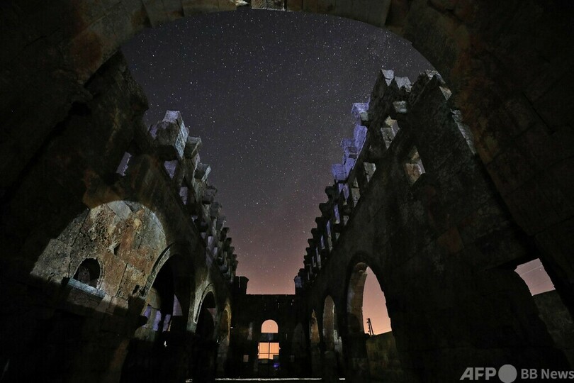 【8月7日 AFP】5世紀に建てられたシリアのバシリカ式教会堂と、上空に昇る天の川銀河(銀河系、Milky Way)。