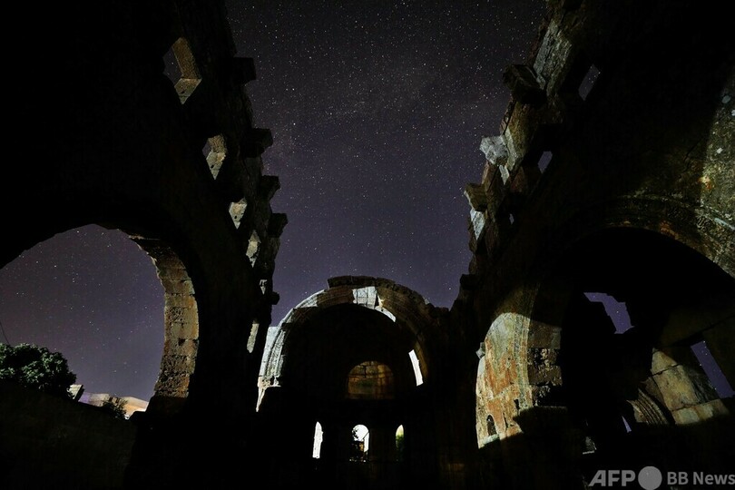 【8月7日 AFP】5世紀に建てられたシリアのバシリカ式教会堂と、上空に昇る天の川銀河(銀河系、Milky Way)。