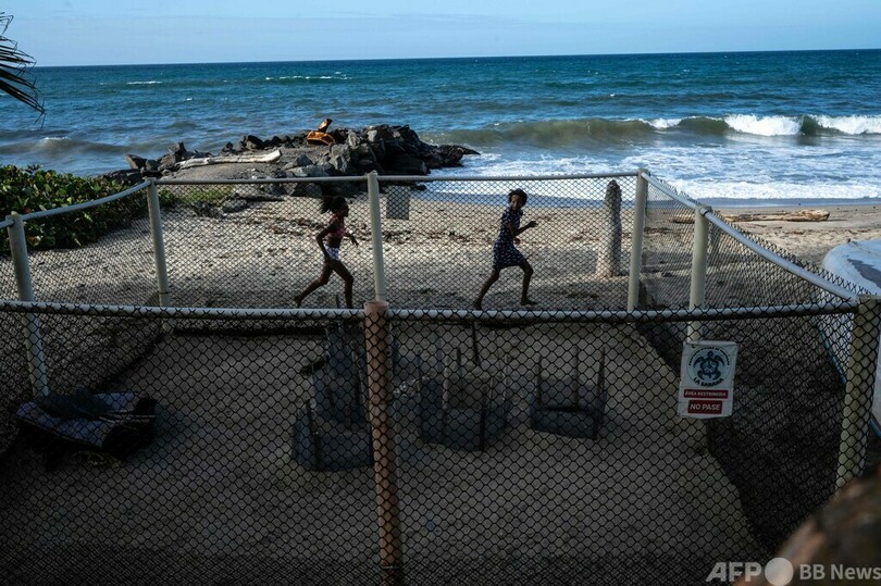 海辺では、子どもたちがふ化したばかりのカメの赤ちゃんを海に返している。興奮を隠しきれない様子で砂の上にそっと放していた。(c)AFP