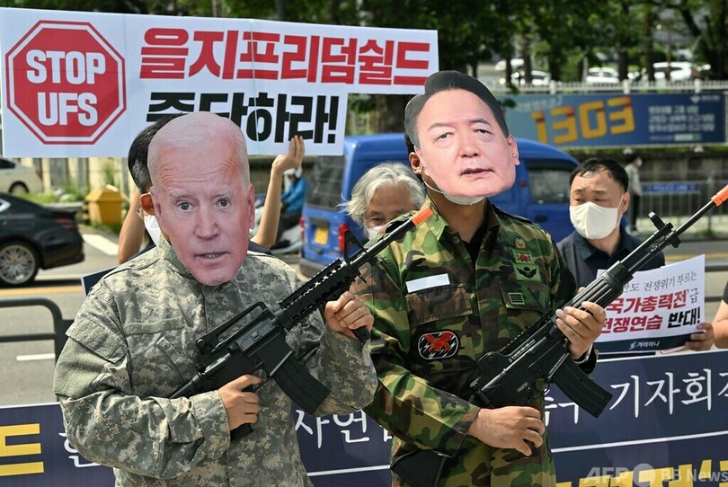 【8月4日 AFP】韓国ソウルの大統領府が入る庁舎近くで4日、反戦活動家グループが今月末からの米韓合同軍事演習「乙支(ウルチ)フリーダムシールド(Ulchi Freedom Shield)」に抗議するデモを実施した。尹錫悦(ユン・ソンニョル、Yoon Suk-yeol)大統領やジョー・バイデン(Joe Biden)米大統領のお面を着けた活動家の姿も見られた。(c)AFP