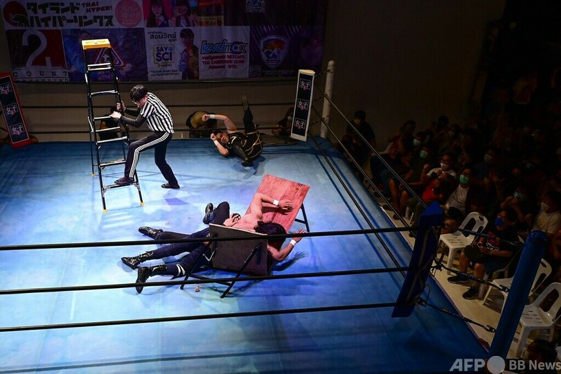 【8月21日 AFP】タイ・バンコクのバイクタクシーの運転手がよく着ているオレンジ色のベストとヘルメットを着けて、レスラーがプロレスリングに飛び出した。リングネームは「ピー・スチャート」だ。