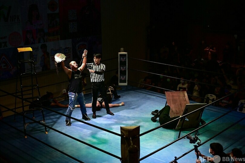 【8月21日 AFP】タイ・バンコクのバイクタクシーの運転手がよく着ているオレンジ色のベストとヘルメットを着けて、レスラーがプロレスリングに飛び出した。リングネームは「ピー・スチャート」だ。