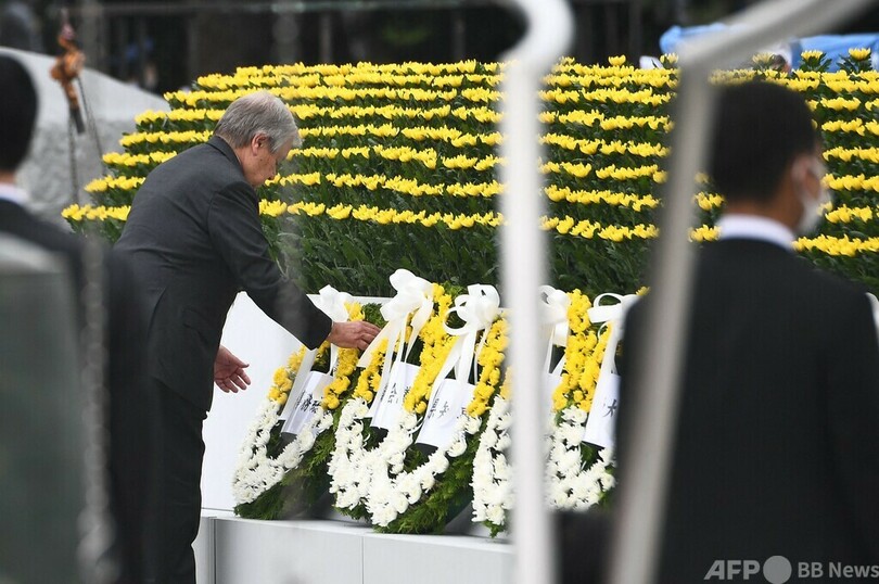 【8月6日 AFP】世界で初めて原爆が投下されて77年を迎えた広島市で6日、平和記念式典が行われ、岸田文雄(Fumio Kishida)首相、国連(UN)のアントニオ・グテレス(Antonio Guterres)事務総長、広島市の松井一実(Kazumi Matsui)市長らがあいさつを行った。(c)AFP