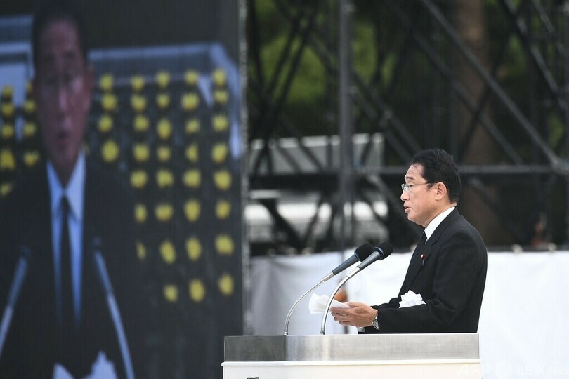 【8月6日 AFP】世界で初めて原爆が投下されて77年を迎えた広島市で6日、平和記念式典が行われ、岸田文雄(Fumio Kishida)首相、国連(UN)のアントニオ・グテレス(Antonio Guterres)事務総長、広島市の松井一実(Kazumi Matsui)市長らがあいさつを行った。(c)AFP