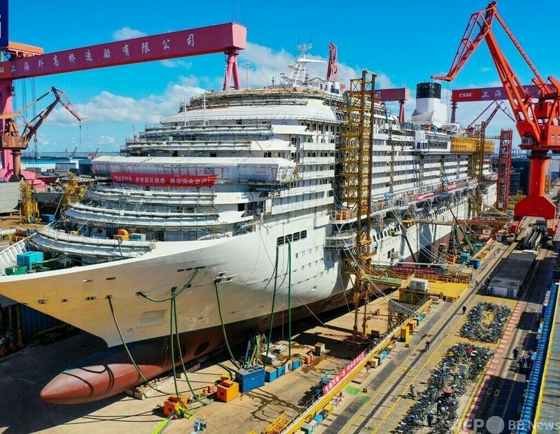 2隻目の国産大型クルーズ船は1隻目に比べて設計・建造サイクルが6カ月短縮されます。現在、クルーズ船の詳細設計はすでに4割ほど完成しており、生産と設計のバランスのとれた進捗(しんちょく)と構造物の設計・製図作業が全面的に始まっています。(c)CGTN Japanese/AFPBB News