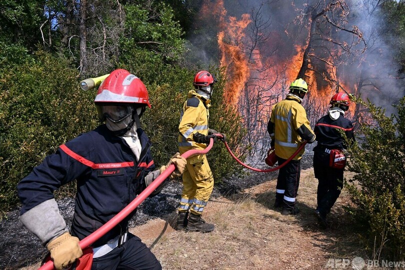 【8月15日 AFP】フランス南部ボワーヌ(Boyne)のグランコッス自然公園(Grands Causses Natural Park)で山火事が発生し、木々が激しく炎を上げる中、消防による消火活動が行われた。(c)AFP