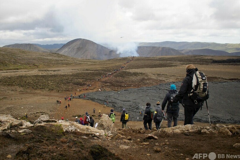 【8月12日 AFP】アイスランドの首都レイキャビクから40キロほど離れたメラタリル(Meradalir)渓谷に、今月3日に噴火した火山を一目見ようと大勢が集まっている。皆、険しいでこぼこの山道を数時間かけて登りやって来る。