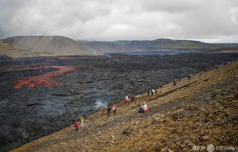 【8月12日 AFP】アイスランドの首都レイキャビクから40キロほど離れたメラタリル(Meradalir)渓谷に、今月3日に噴火した火山を一目見ようと大勢が集まっている。皆、険しいでこぼこの山道を数時間かけて登りやって来る。