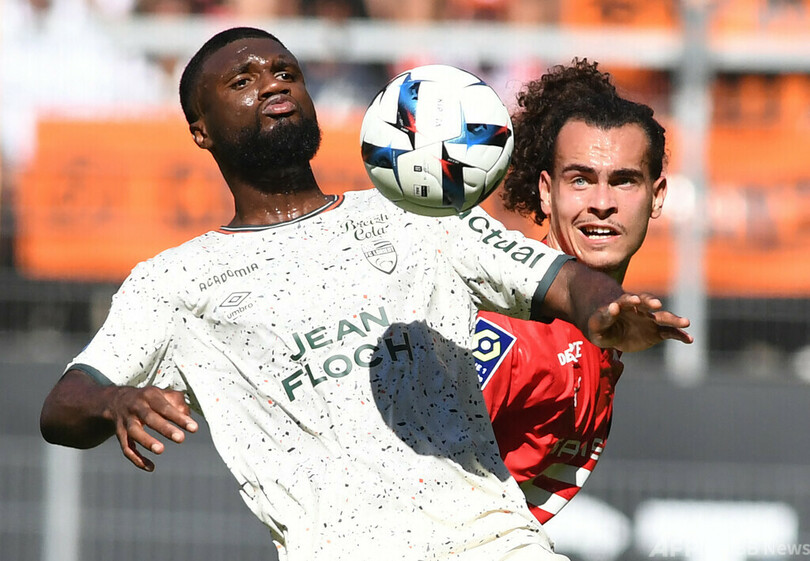 【8月22日 AFP】フランス・リーグ1、レンヌ(Stade Rennais FC)対ロリアン(FC Lorient)戦。ボールを競り合うレンヌのベルギー人DFアルトゥール・テアテ(Arthur Theate、右)とロリアンのナイジェリア人FWテレム・モッフィ(Terem Moffi)。仏西部レンヌ(Rennes)のロアゾン・パーク・スタジアム(Roazhon Park Stadium)で。(c)AFP
