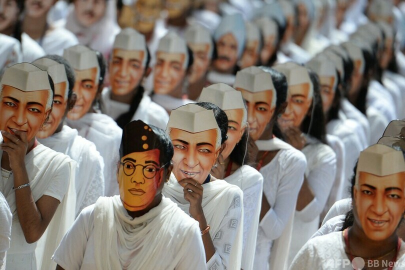 【8月15日 AFP】インド南部チェンナイ(Chennai)で12日、15日に独立75年を迎えるのを記念し、女子学生がマハトマ・ガンジー(Mahatma Gandhi)ら英国からの独立運動の英雄のお面を着けた。(c)AFP