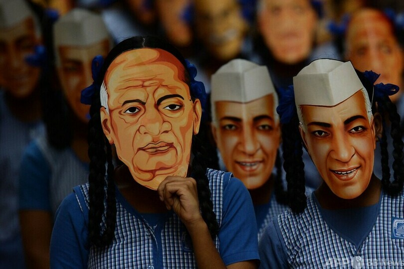 【8月15日 AFP】インド南部チェンナイ(Chennai)で12日、15日に独立75年を迎えるのを記念し、女子学生がマハトマ・ガンジー(Mahatma Gandhi)ら英国からの独立運動の英雄のお面を着けた。(c)AFP