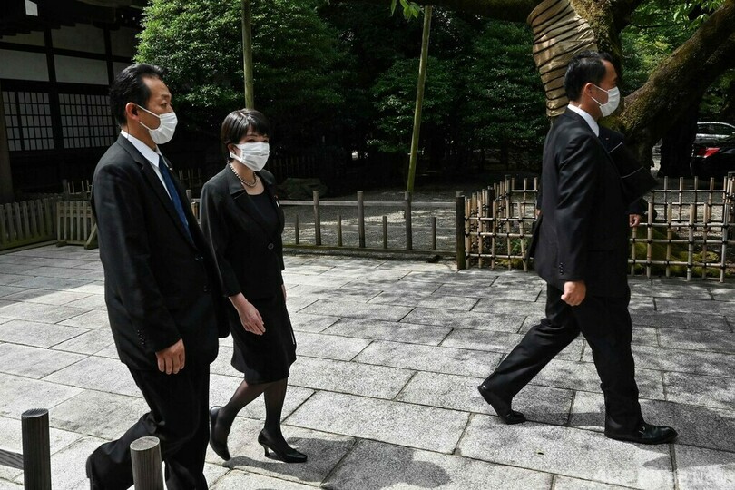 高市氏は、先月銃撃を受け死去した安倍晋三(Shinzo Abe)元首相に近い人物で、以前からたびたび靖国神社を参拝していた。一方、昨年10月に就任した岸田文雄(Fumio Kishida)首相は参拝せず、私費で玉串料を納めた。現職首相の参拝は2013年の安倍氏が最後で、当時、中国と韓国の反発を招いた他、米国からも異例の批判を受けた。(c)AFP