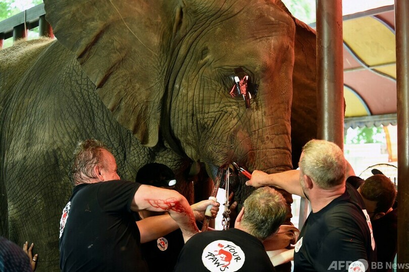 獣医師チームは「特別に開発されたとても長い」歯科治療用ドリルを使い、残った牙を取り除いた。続けて別のゾウの牙の処置も行われるという。(c)AFP