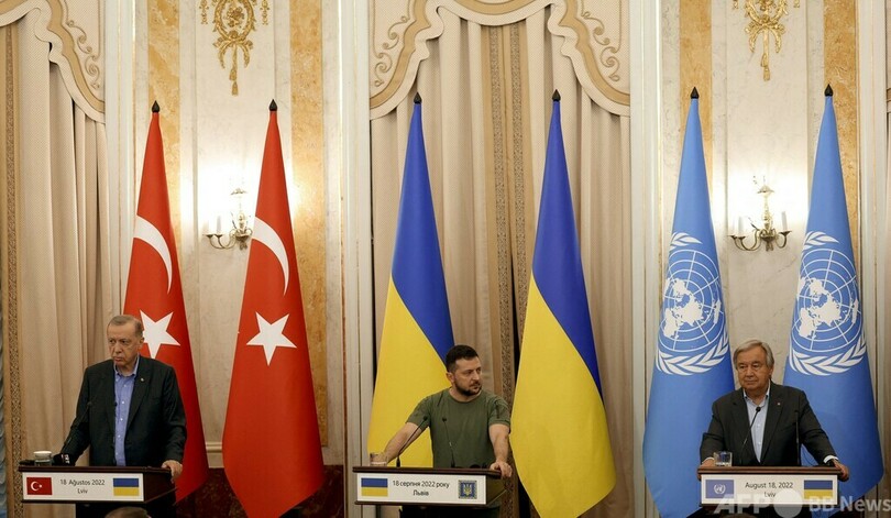 【8月19日 AFP】トルコのレジェプ・タイップ・エルドアン(Recep Tayyip Erdogan)大統領は18日、ウクライナ西部リビウ(Lviv)で同国のウォロディミル・ゼレンスキー(Volodymyr Zelensky)大統領と国連(UN)のアントニオ・グテレス(Antonio Guterres)事務総長と3者会談を行い、ウクライナでの核災害の恐れについて警告した。エルドアン氏とゼレンスキー氏の直接会談は、ロシアのウクライナ侵攻開始後で初めて。