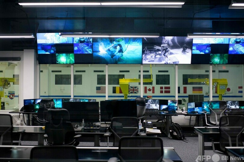 AFP取材班が施設を訪れた日は、技術者とダイバーが月面での台車の移動を試行していた。